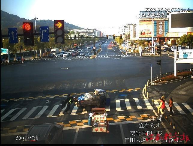 三輪車在宜春路口拋錨,警民合力一分鐘疏堵