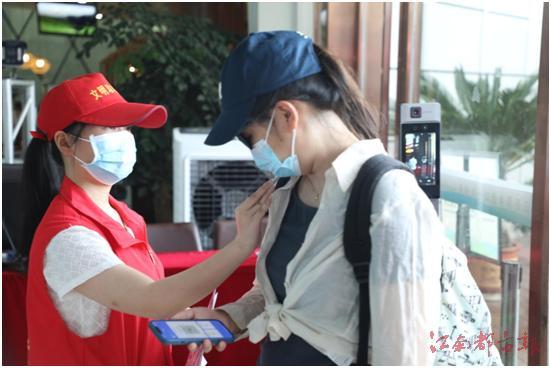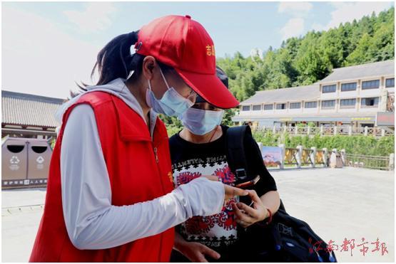 江南都市報訊 黃思源、蘭春、全媒體記者范晶攝影報道:“您好,請配合掃場所碼,佩戴好口罩,有序進場……”8月18日上午,在武功山游客服務(wù)中心入口處,工作人員不時提醒游客佩戴好口罩,主動掃“三碼”,配合測量體溫,并保持一米距離有序入園。