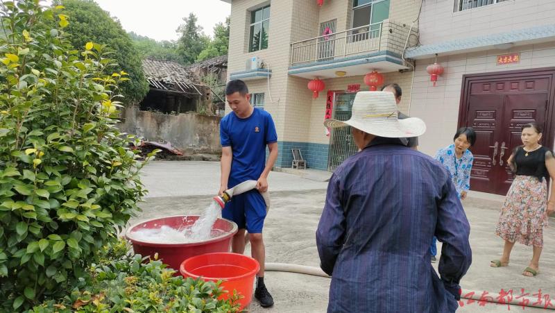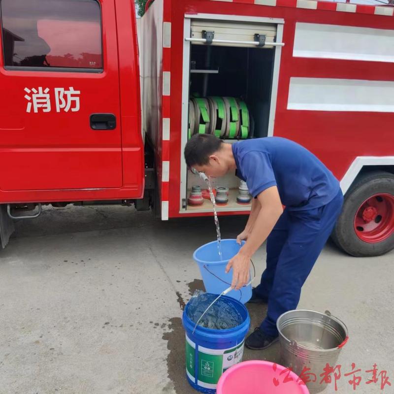 據(jù)了解,當(dāng)?shù)厥芨邷馗珊涤绊?,已有多日無生活用水,只能求助消防隊(duì)送水。接到求助電話后,上埠鎮(zhèn)政府專職隊(duì)立即將消防車進(jìn)行了清洗,重新裝修上干凈的自來水后駛向受災(zāi)村莊。