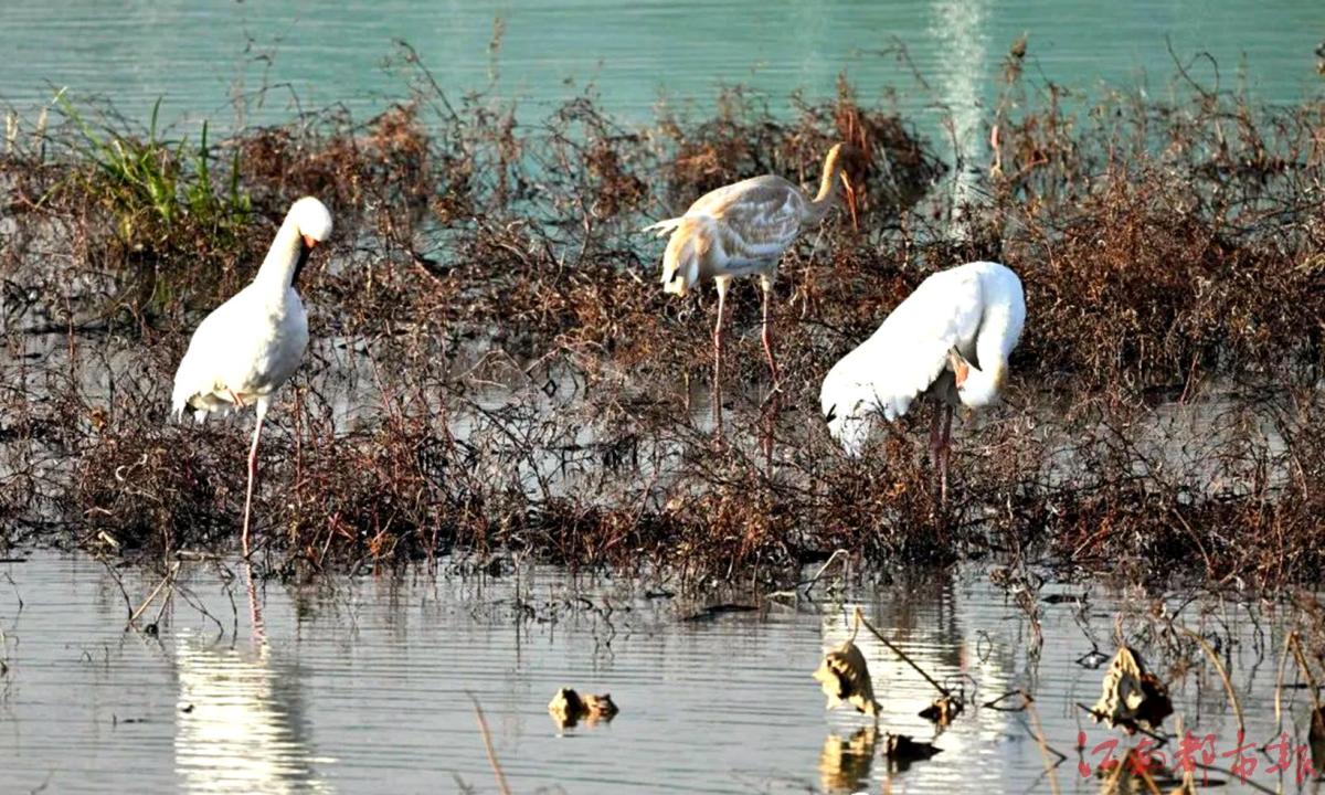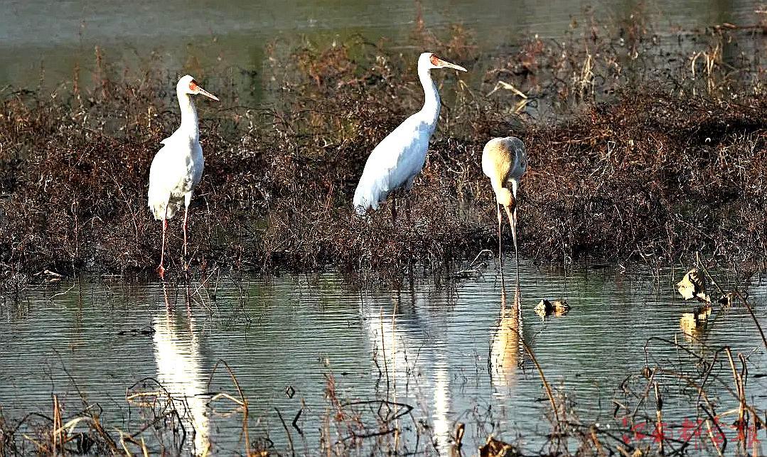 江南都市報(bào)訊 全媒體記者許南平攝影報(bào)道:12月21日,江西鄱陽湖國家級自然保護(hù)區(qū)管理局科研人員王小龍?jiān)诘靥幹袊蝤B小鎮(zhèn)的永修吳城鎮(zhèn)鄱陽湖生態(tài)濕地公園科考中,驚喜發(fā)現(xiàn)3只白鶴棲息濕地公園內(nèi)。這是鄱陽湖生態(tài)濕地公園2021年建立以來,首次監(jiān)測到野生白鶴。白鶴是世界極危物種,被列入《世界自然保護(hù)聯(lián)盟》(IUCN)極危物種。目前全球僅存4000余只,其中每年約98%在鄱陽湖越冬。白鶴棲息于開闊平原沼澤草地、苔原沼澤和大的湖泊巖邊及淺水沼澤地帶。其主要以苦草、眼子菜、苔草、荸薺等植物的莖和塊根為食,也吃水生植物的葉、嫩芽和少量蚌、螺等軟體動(dòng)物、昆蟲、甲殼動(dòng)物等動(dòng)物性食物。白鶴是一種冬候鳥,每年六至八月在俄羅斯境內(nèi)的西伯利亞繁殖,九十月在中國東北吉林境內(nèi)的莫莫格濕地停歇一個(gè)月左右,再啟程南下至江西鄱陽湖越冬,翌年3月中下旬開始遷飛回北方。