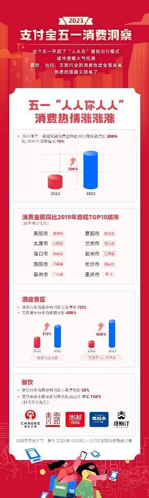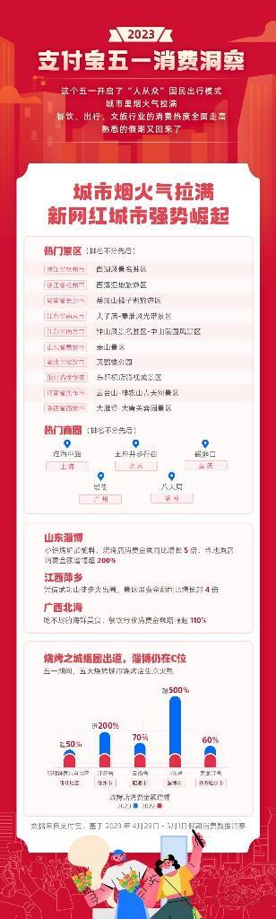 五一假期是全年的重要消費(fèi)假期,支付寶平臺(tái)在4月21日起聯(lián)合全國(guó)千萬(wàn)商家啟動(dòng)“春季消費(fèi)節(jié)”,多管齊下拉消費(fèi):消費(fèi)者掃商家紅包碼領(lǐng)取優(yōu)惠;激發(fā)比去年多1倍的小程序商家參與;用戶(hù)上支付寶搜“消費(fèi)節(jié)”,可翻到最高88元紅包以及數(shù)百種商家優(yōu)惠,為商家?guī)?lái)充滿(mǎn)煙火氣的一個(gè)消費(fèi)節(jié)。支付寶五一消費(fèi)洞察佐證出假期消費(fèi)強(qiáng)勁的爆發(fā)趨勢(shì)。同時(shí)因?yàn)橄M(fèi)需求旺盛而帶動(dòng)用工需求的增長(zhǎng),形成了循環(huán)。為全年的消費(fèi)增長(zhǎng)開(kāi)了一個(gè)好頭。過(guò)去3年來(lái)的旅游熱情在今年五一迎來(lái)集中釋放。支付寶數(shù)據(jù)顯示,主要消費(fèi)類(lèi)大增長(zhǎng)而可選消費(fèi)則呈現(xiàn)大倍數(shù)增長(zhǎng)。如餐飲行業(yè)同比去年增長(zhǎng)超5成,而文旅景區(qū)行業(yè)消費(fèi)增長(zhǎng)超4倍。在支付寶小程序平臺(tái)上訪問(wèn)增幅最大的幾個(gè)餐飲品牌均各具地方特色:誕生自云南的新茶飲品牌霸王別姬、上海網(wǎng)紅拉面馬記永、南京連鎖中式點(diǎn)心青露饅頭、延吉延邊美食米村拌飯、福州中式漢堡塔斯汀。商圈依舊是假日消費(fèi)需求最旺盛的場(chǎng)景之一。支付寶數(shù)據(jù)顯示,上?;春V新贰⒈本┩醺叫薪?、重慶磁器口、廣州塔街、淄博八大局是全國(guó)熱門(mén)商圈。今年五一,全國(guó)開(kāi)啟了“人從眾”國(guó)民出行模式,動(dòng)起來(lái)絕對(duì)是主旋律。支付寶綜合數(shù)據(jù)顯示,小長(zhǎng)假前3天里使用支付寶交通出行的支付筆數(shù)同比去年增長(zhǎng)230%,且達(dá)到2019年的2.2倍。在支付寶找“租車(chē)”自駕出游、找“充電”服務(wù)分別是2022年同期的2.4倍和3倍。今年騎單車(chē)賞景,在路上揮汗如雨的游客比去年同期也增長(zhǎng)了1.5倍,其中上海人對(duì)騎行的喜愛(ài)在全國(guó)居首。受益于旺盛的旅游需求,海外商家也被中國(guó)游客的消費(fèi)熱情驚到了。五一假期出境游人均消費(fèi)比2019年同期增長(zhǎng)達(dá)40%。在各大主要目的地市場(chǎng)中,亞洲地區(qū)的支付寶境外消費(fèi)增長(zhǎng)最快。中國(guó)香港依然是最受歡迎旅游目的地,其次是中國(guó)澳門(mén)、日本、泰國(guó)和韓國(guó)。煙火氣拉滿(mǎn)!新網(wǎng)紅城市強(qiáng)勢(shì)崛起在游客旅游目的地中,具有地標(biāo)景區(qū)的旅游城市依舊是熱門(mén)之選。杭州西湖、西溪濕地、長(zhǎng)沙岳麓山、南京夫子廟、中山陵、泰山、武漢黃鶴樓、金華橫店、神農(nóng)山、西安大雁塔是今年小長(zhǎng)假Top10熱度景區(qū)。除了老牌的旅游目的地,探索特色潮流小城正成為旅游新趨勢(shì)。一系列二三線城市也抓住五一消費(fèi)高峰,推出城市特色旅游名片,各顯其能招待外地游客。燒烤絕對(duì)是今年五一最熱美食關(guān)鍵詞,淄博的旅游熱度從五一前就一路走高,支付寶統(tǒng)計(jì)數(shù)據(jù)顯示,消費(fèi)者在淄博燒烤店消費(fèi)金額暴漲超5倍,帶動(dòng)酒店消費(fèi)金額增幅也超2倍。鑒于淄博接待力飽和,各地紛紛花式拉游客,新疆、江蘇、東北、云南等各地?zé)径季砹似饋?lái),江蘇徐州燒烤緊隨淄博之后消費(fèi)金額增長(zhǎng)近2倍。除了出門(mén)也有很多人選擇在家里“讓耳朵去旅行”。假期前三天,支付寶「讀書(shū)聽(tīng)書(shū)」頻道的用戶(hù)數(shù)相較前三天增長(zhǎng)了近4成,點(diǎn)擊量最高的三本有聲讀物是《三體廣播劇》《停止你的精神內(nèi)耗》《人生歌單:66首必聽(tīng)世界名曲》。此外,當(dāng)假日消費(fèi)如火如荼的 同時(shí),假期靈活用工的需求也隨之?dāng)U大。趁著假期兼職搞錢(qián),正在成為這屆年輕人過(guò)五一的流行趨勢(shì)。支付寶平臺(tái)顯示,五一前夕,在支付寶就業(yè)頻道找工作的用戶(hù)數(shù)環(huán)比上漲超6成,劇本殺NPC、牛奶試吃員、民宿管家、婚禮布置人員、古代漢服試衣成為今年五一最受歡迎新奇特職業(yè)。