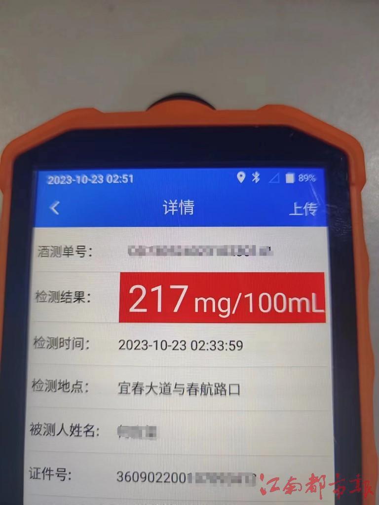 江南都市報(bào)訊 全媒體記者胡琴攝影報(bào)道:10月23日凌晨,在宜春市宜春大道,一小伙醉駕遇到交警夜查,小伙自稱喝得不多,交警讓他吹氣,酒精值卻高達(dá)217mg/100ml。