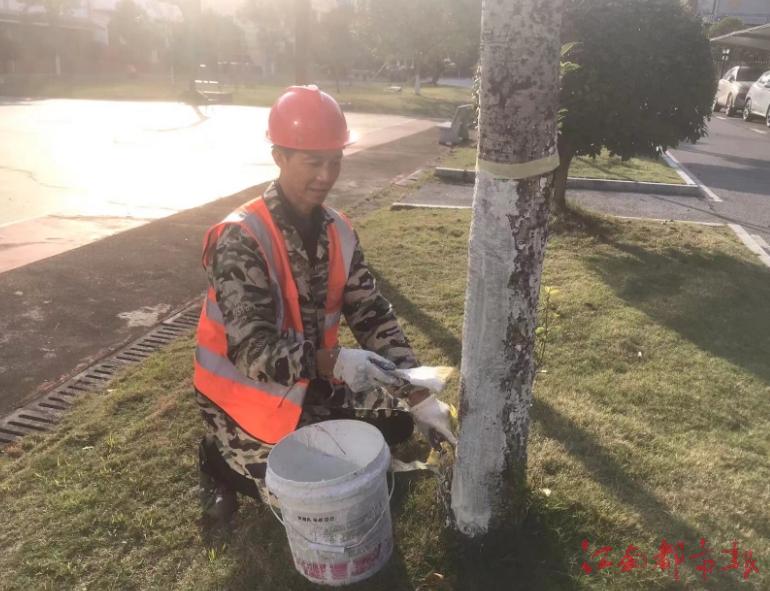 整齊“穿白衣”。該站汲取歷年來綠植刷白的經(jīng)驗,先在樹干離地面測出統(tǒng)一的高度進行標記,再用含硫磺的石灰水對樹干進行涂刷,有效保障了“白衣”的穿著規(guī)整。起到了反射陽光、減小樹木晝夜溫差、防止樹木凍裂的作用;還可以殺死樹木中的病菌越冬蟲卵。