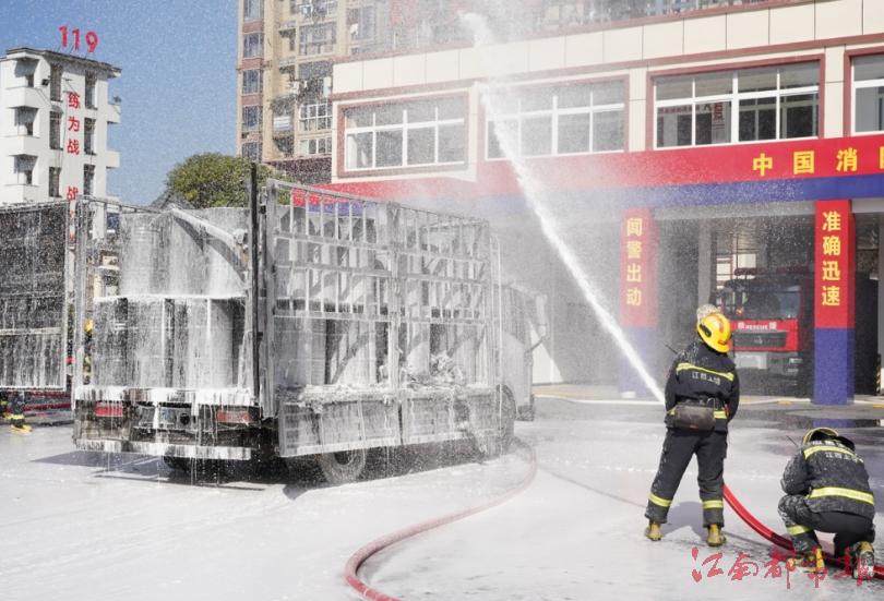 江南都市報訊 郭睿、全媒體記者何柳斌攝影報道:12月25日11時40分,德興市一輛滿載松樹油的貨車起火。司機立即撥打119火警電話并開進附件的德興市消防救援大隊救助。