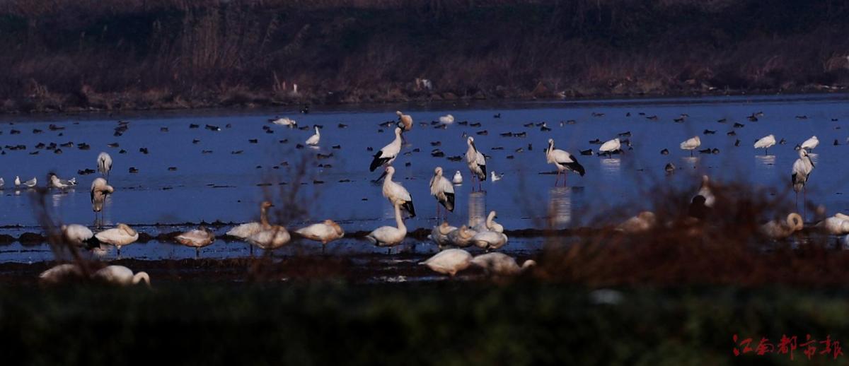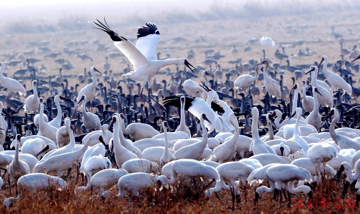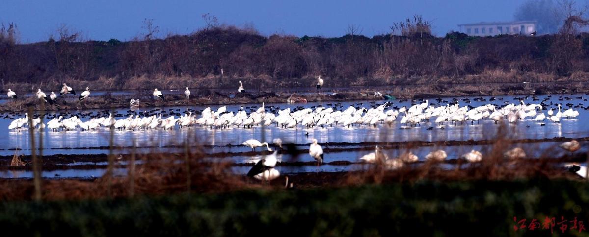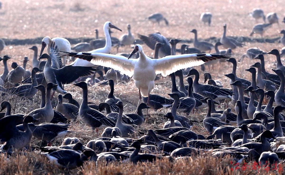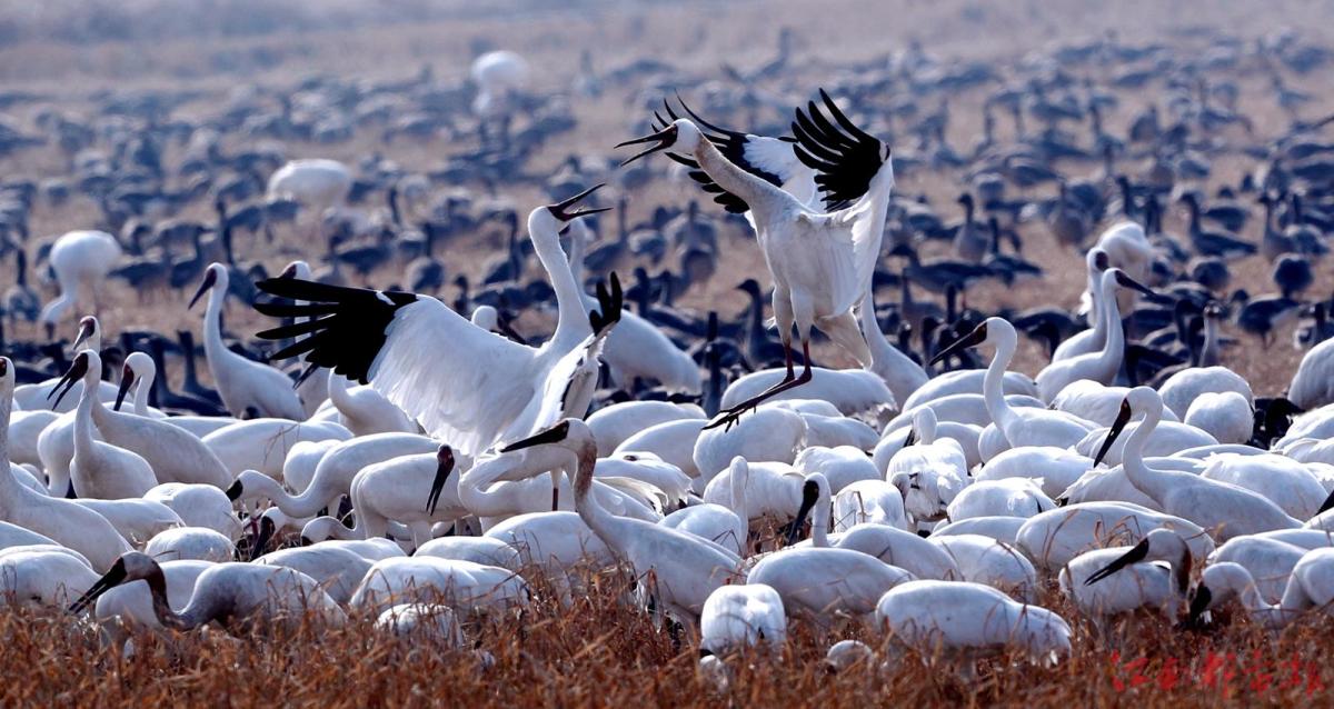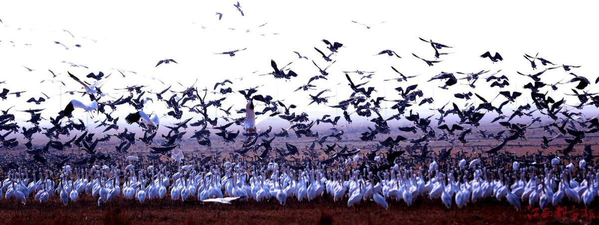 江南都市報(bào)訊 全媒體記者許南平攝影報(bào)道:1月3日,江南都市報(bào)聯(lián)合湖南瀟湘晨報(bào),一起走進(jìn)余干縣康山墾殖場(chǎng)插旗洲分場(chǎng),以慢直播、微直播等方式,和廣大讀者網(wǎng)友分享數(shù)萬(wàn)只候鳥在“田園鶴谷”覓食棲息的震撼場(chǎng)景。當(dāng)日,白鶴、白頭鶴、東方白鸛、白枕鶴、灰鶴、小天鵝、白琵鷺、豆雁、鴻雁等候鳥成群結(jié)隊(duì)鉆入稻田、湖泊。它們時(shí)而信步徜徉,時(shí)而竊竊私語(yǔ),時(shí)而引頸高歌,時(shí)而展翅騰飛,時(shí)而在水面嬉逐起舞,時(shí)而成群掠湖翱翔,形成了“千鶴鬧鄱湖,萬(wàn)人齊觀賞”的獨(dú)特景觀。在這美麗的天水之間,它們又仿佛是世界上最偉大的交響樂(lè)隊(duì),在演奏大自然最美妙的音樂(lè),與鄱陽(yáng)湖構(gòu)成一幅人與自然和諧共生的美好圖畫。鄱陽(yáng)湖位于東亞-澳大利亞候鳥遷徙路線上,是極為重要的候鳥越冬棲息地。近些年,余干縣持續(xù)開展生態(tài)環(huán)境專項(xiàng)整治,候鳥的生存環(huán)境不斷改善,當(dāng)?shù)亓己玫纳鷳B(tài)環(huán)境吸引越來(lái)越多的越冬候鳥來(lái)?xiàng)⒁捠场?/p>