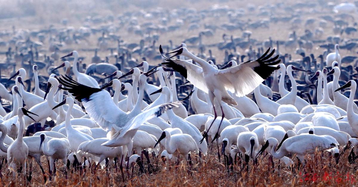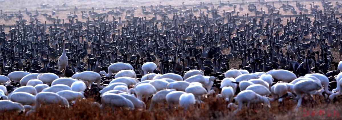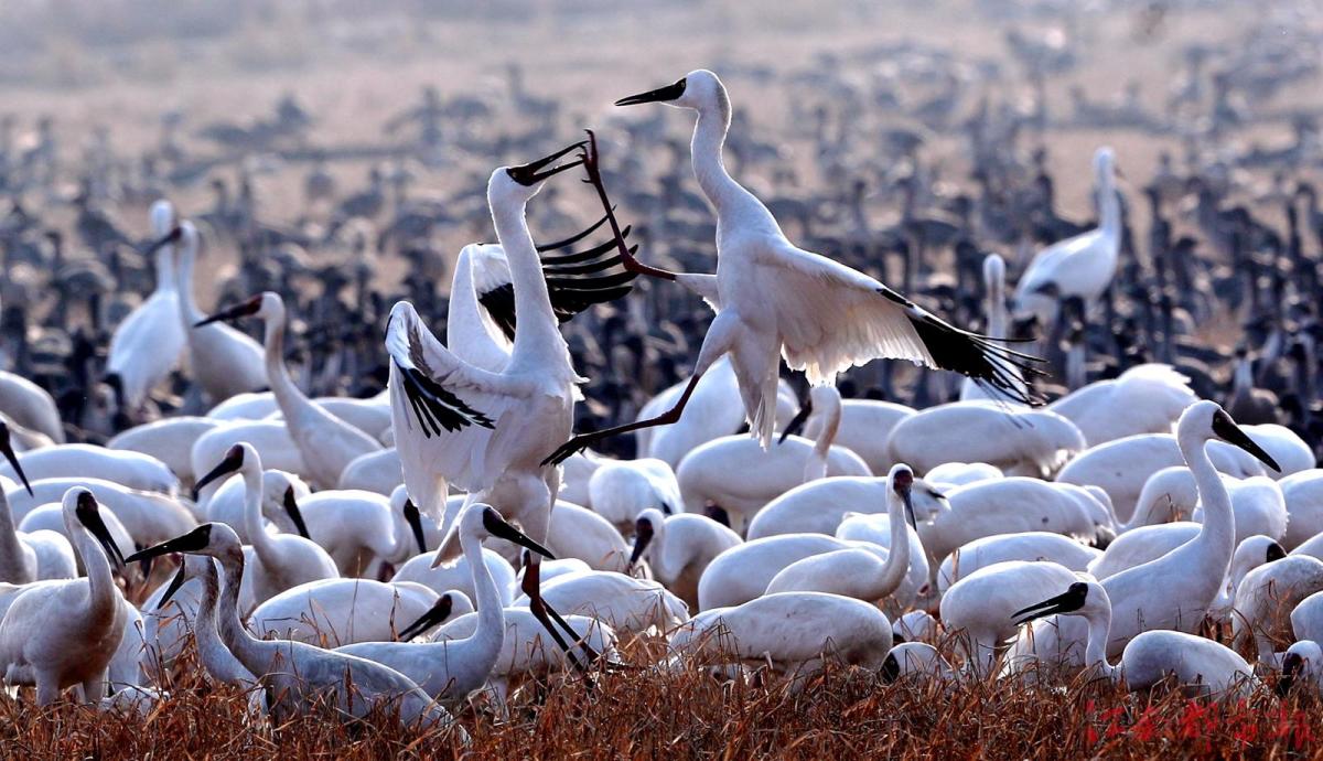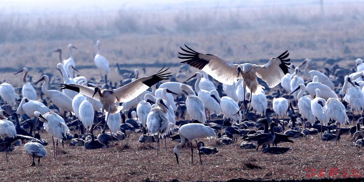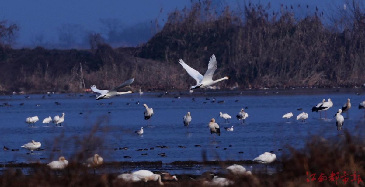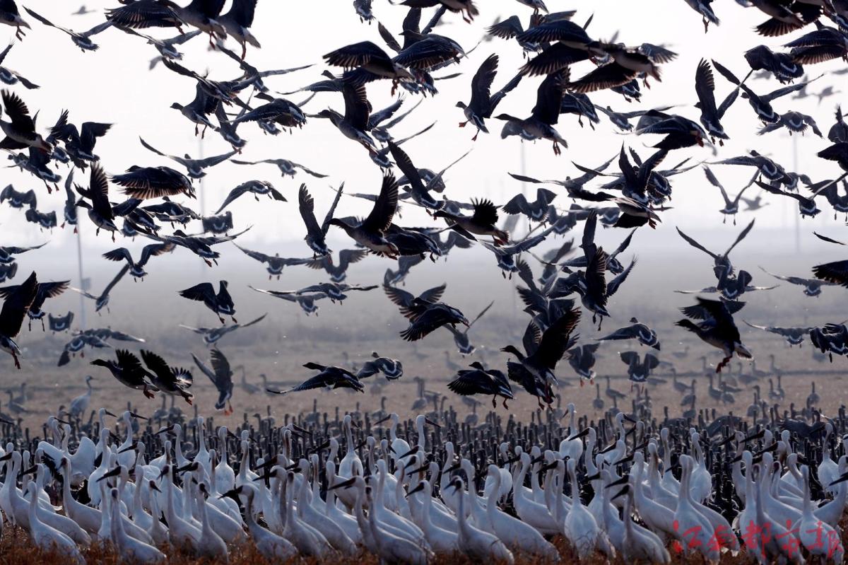 江南都市報(bào)訊 全媒體記者許南平攝影報(bào)道:1月3日,江南都市報(bào)聯(lián)合湖南瀟湘晨報(bào),一起走進(jìn)余干縣康山墾殖場(chǎng)插旗洲分場(chǎng),以慢直播、微直播等方式,和廣大讀者網(wǎng)友分享數(shù)萬(wàn)只候鳥在“田園鶴谷”覓食棲息的震撼場(chǎng)景。當(dāng)日,白鶴、白頭鶴、東方白鸛、白枕鶴、灰鶴、小天鵝、白琵鷺、豆雁、鴻雁等候鳥成群結(jié)隊(duì)鉆入稻田、湖泊。它們時(shí)而信步徜徉,時(shí)而竊竊私語(yǔ),時(shí)而引頸高歌,時(shí)而展翅騰飛,時(shí)而在水面嬉逐起舞,時(shí)而成群掠湖翱翔,形成了“千鶴鬧鄱湖,萬(wàn)人齊觀賞”的獨(dú)特景觀。在這美麗的天水之間,它們又仿佛是世界上最偉大的交響樂(lè)隊(duì),在演奏大自然最美妙的音樂(lè),與鄱陽(yáng)湖構(gòu)成一幅人與自然和諧共生的美好圖畫。鄱陽(yáng)湖位于東亞-澳大利亞候鳥遷徙路線上,是極為重要的候鳥越冬棲息地。近些年,余干縣持續(xù)開展生態(tài)環(huán)境專項(xiàng)整治,候鳥的生存環(huán)境不斷改善,當(dāng)?shù)亓己玫纳鷳B(tài)環(huán)境吸引越來(lái)越多的越冬候鳥來(lái)?xiàng)⒁捠场?/p>