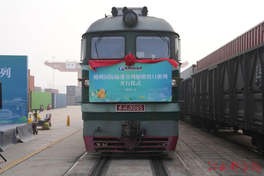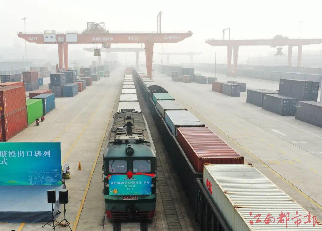 江南都市報(bào)訊 全媒體記者章娜、實(shí)習(xí)生姜夢(mèng)、熊羽掀攝影報(bào)道:1月16日上午,贛州國(guó)際陸港首趟贛南臍橙出口班列緩緩駛出,該班列載著200噸贛南臍橙,通過(guò)鐵海聯(lián)運(yùn)從贛州國(guó)際陸港起運(yùn),經(jīng)深圳蛇口港裝船運(yùn)至馬來(lái)西亞等地。
