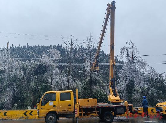 湘東區(qū)白竺鄉(xiāng)受到雨雪冰凍天氣的影響,山區(qū)樹(shù)木覆蓋上了一層厚厚的積雪,這給轄區(qū)電網(wǎng)帶來(lái)了極大的挑戰(zhàn)。厚厚的積雪不但壓彎了樹(shù)枝,還覆蓋在了供電線路上,嚴(yán)重影響了供電線路的安全穩(wěn)定運(yùn)行。為保障白竺鄉(xiāng)數(shù)千戶居民正常用電,國(guó)網(wǎng)萍鄉(xiāng)市湘東區(qū)供電公司人員迅速響應(yīng),組織人員車輛沿著線路一邊處理樹(shù)障,一邊利用登高車輛及各類工具對(duì)覆冰線路進(jìn)行清理。