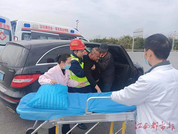 2月17日,贛州車輛救援大隊于都東中隊在寧定高速寧安段巡路時發(fā)現(xiàn)一輛小車停在應(yīng)急車道上,司機未做任何安全保障措施。班長周文煜立即上前查看,只見司機面色蒼白、呼吸急促,捂住胸口趴在車門上。“師傅,您是哪里不舒服嗎?”“我心肌梗塞突發(fā),藥吃完了”……情況緊急,周文煜和同事即刻展開救援,在做好安全圍蔽后將司機扶到護欄外草坪上平臥休息,并聯(lián)系120急救中心。為了爭取寶貴的搶救時間,他們開車將司機送至仙下收費站出口與急救車匯合。司機第一時間被送至醫(yī)院救治。