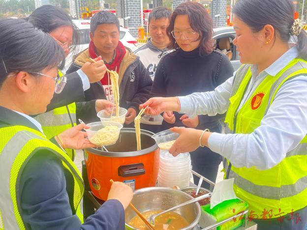 2月17日8時起,受春運返程高峰影響,龍南西收費站外廣場陸續(xù)有車輛聚集,并且短時間快速增多,工作人員立刻投入保暢工作。當(dāng)了解到很多司乘都是連夜趕車,沒有吃早飯,工作人員便為司乘免費提供面條和燙皮等食物。“我們是從湖南趕回廣州的,因為高速上車輛太多臨時在龍南西收費站下高速,沒想到在這還能吃到免費的面條,江西老表很熱情,給你們點贊”,司機謝師傅笑著說道。據(jù)悉,當(dāng)天龍南西收費站為150余人次司乘人員免費提供食物充饑,同時還護送了兩名病人到醫(yī)院就醫(yī),一系列暖心頭的事讓司乘朋友的返程旅途更有溫度。