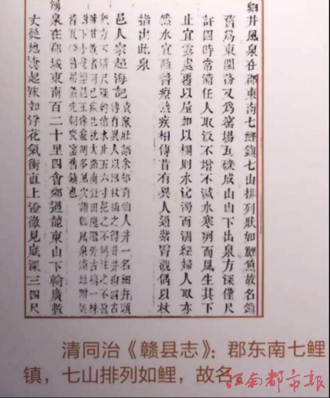 “七鯉”名字的由來(lái),據(jù)清同治十一年《贛縣志》記載:“郡東南七里鎮(zhèn),七山排列如鯉,故名。”而在民間,浪漫的七鯉人為“七山排列如鯉”口口相傳著一個(gè)美麗的傳說(shuō):很久以前,遠(yuǎn)居?xùn)|海龍宮的七位小龍女,從老龍王那兒聽(tīng)說(shuō)虔州(即現(xiàn)章貢區(qū))山川奇特、風(fēng)景秀麗,于是商定前往游覽。她們變成七條鯉魚(yú),從東海進(jìn)長(zhǎng)江、入鄱陽(yáng)湖,而后再溯江而上,沿贛江來(lái)到貢江一帶玩耍。旖旎的風(fēng)光使她們流連忘返,不肯返回龍宮,后被觀音點(diǎn)化成七座小山,散落在七里一帶,形似七條鯉魚(yú),故名七鯉鎮(zhèn)。