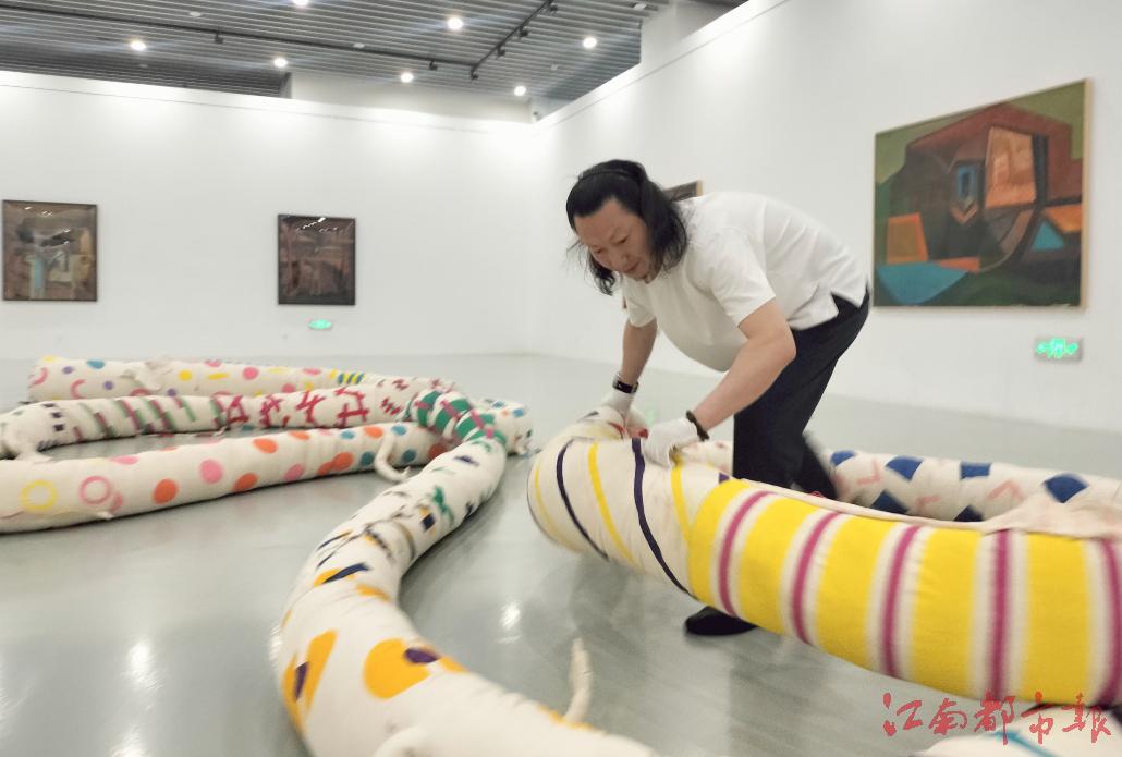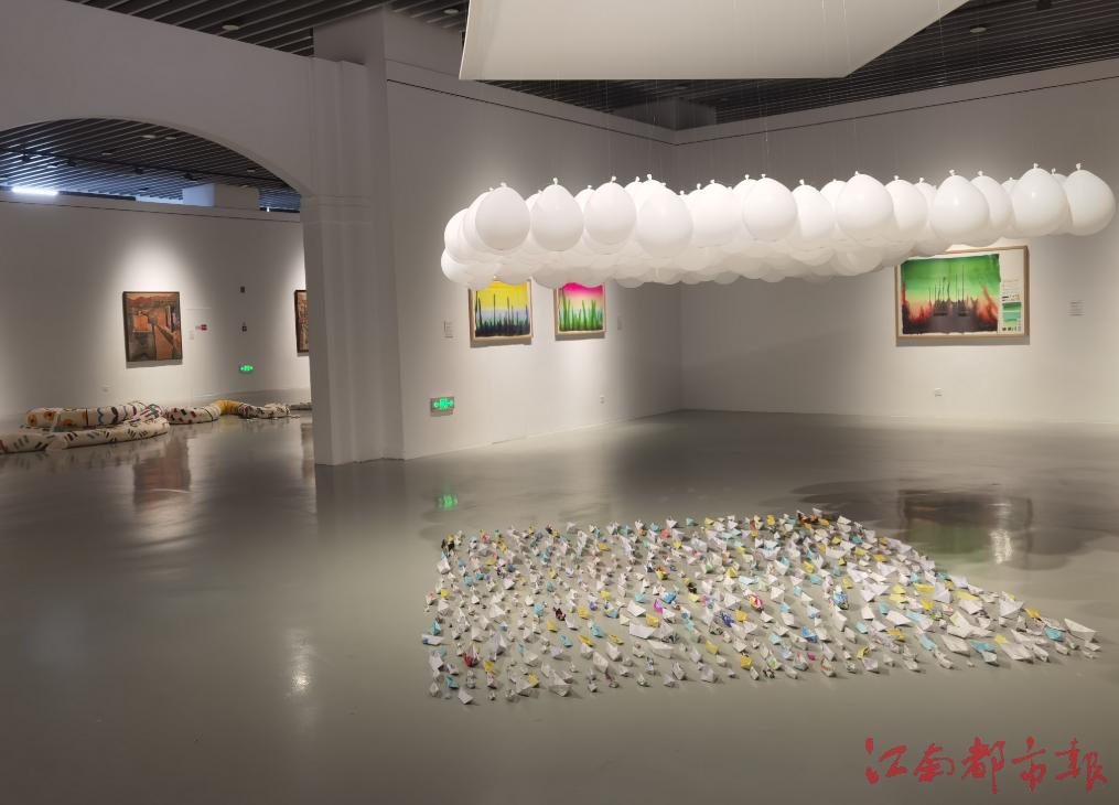 展覽開幕恰逢端午節(jié)小長假前夕,風(fēng)格獨特的展品吸引了眾多觀眾駐足欣賞,一組氣球制作的裝置作品成為熱門打卡點。張思永解讀道,漂浮的氣球象征著夢想,藝術(shù)家以孩童般的視角觀察成人世界,旨在沖破現(xiàn)實的藩籬,打破陳規(guī)。