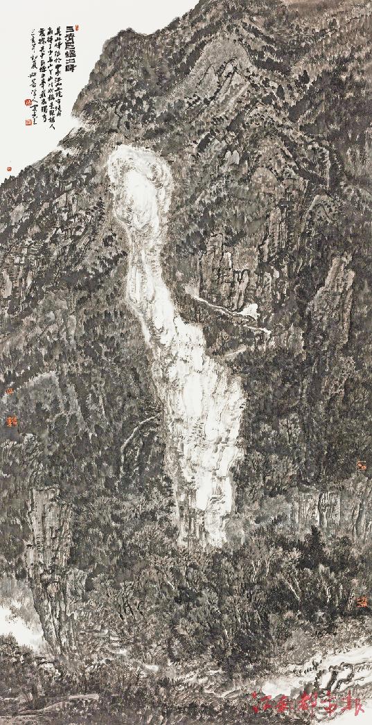 柳時(shí)浩的水墨山水畫,黑中見物,黑中透亮。那被形容為黑夜中光束一般的“亮”,如同黎明時(shí)躍出地平線的朝陽般耀眼。他的畫作幾乎摒棄其他色彩,僅以水與墨調(diào)和出純粹的黑白。在濃墨的映襯下,留白勾勒出的路徑、水際線或天空,宛如明亮的色帶,形成強(qiáng)烈的黑白對(duì)比,極具視覺沖擊力。