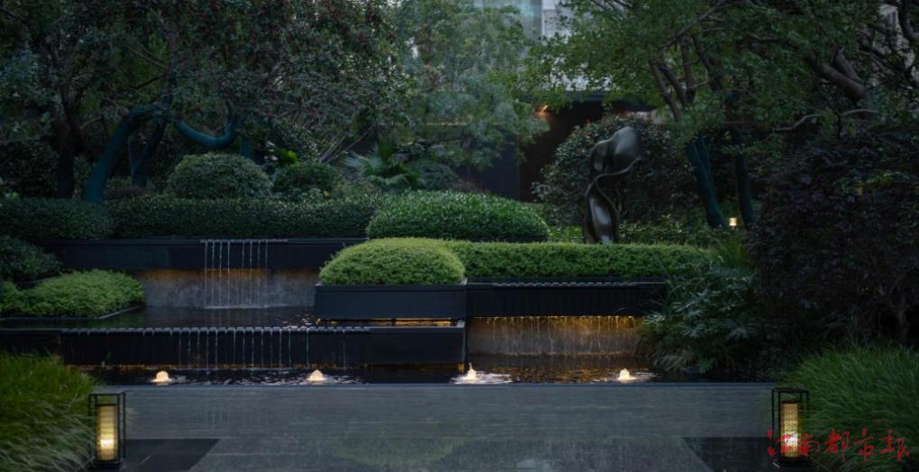 而最令人矚目的當屬園林的三重疊水。其設計巧妙借鑒寶格麗珠寶的層疊美學,三層水景層層遞進,如同一串精心雕琢的寶石項鏈,鑲嵌在園林之中。水流順著精心打磨的大理石臺面傾瀉而下,泛起層層晶瑩的水花,在陽光下折射出璀璨的光芒,與寶格麗珠寶的閃耀質感如出一轍。潺潺水聲縈繞耳畔,仿佛奏響一曲靈動的樂章,為園林增添了幾分優(yōu)雅與靜謐。