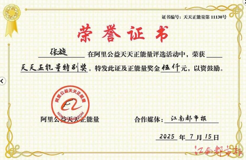 江南都市報(bào)聯(lián)合阿里公益天天正能量,為張旋頒發(fā)天天正能量特別獎(jiǎng)并獎(jiǎng)勵(lì)5000元,表彰他以凡人之軀行勇者之事,用一念之善護(hù)稚子周全。