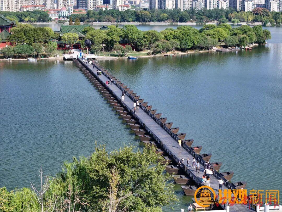 項(xiàng)目主要包含連通象湖西岸和湖心島的水上檢修棧道、橋頭兩岸的廣場(chǎng)(含牌樓等廣場(chǎng)設(shè)施)、景觀照明及監(jiān)控等內(nèi)容。新建水上檢修棧道全長202.8米,橋?qū)捈s4米,采用鋼船承載。2025年4月20日開工建設(shè),6月30日基本完工,9月1日正式對(duì)市民游客開放,并命名為“書院橋”。